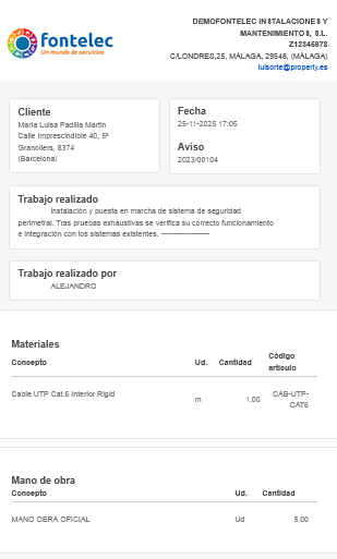 Comprueba cómo queda el informe que recoge la información del técnico: fotos, materiales, tiempos, servicios contratados, firma del cliente e incidencias. Todo en un único documento, claro y profesional.